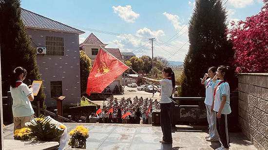 祭掃儀式在肅穆氛圍中拉開帷幕。大隊旗組整齊出旗,全場師生肅立注目、行隊禮,三名少先隊員邁著鏗鏘正步,護送隊旗莊嚴行進。全體人員齊聲高唱國歌與中國少年先鋒隊隊歌,嘹亮歌聲回蕩陵園。