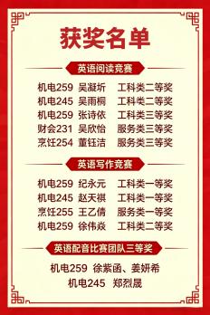 賽后,獲得英語寫作(服務類)一等獎的王乙倩同學激動地說:“一個多月的‘魔鬼訓練’沒有白費,感謝老師每天陪我們改作文到天黑。這個獎證明了只要肯下功夫,我們中職生一樣能行!”指導老師呂澤旭也表示:“孩子們每天堅持練習,從不敢開口到自信表達,從害怕寫作到條理清晰,這份榮譽是他們用無數個日夜的汗水換來的。看到他們成長,就是老師最大的欣慰。”