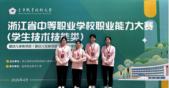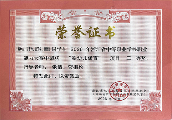 康養護理系:蔣樂雨、胡吉玲、孫藝銘、董炎炎四位同學在嬰幼兒保育賽項中榮獲省三等獎。指導老師:賀楷倫、張倩;班主任:林紅。