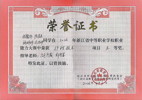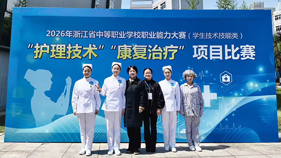 康養護理系:張馨彤、陳姿米、俞思伊、施婷婷四位同學在護理技術賽項中榮獲省三等獎。指導老師:胡舟霞、鄭舟軍;班主任:章丹丹、郭怡。