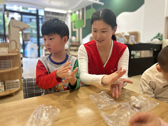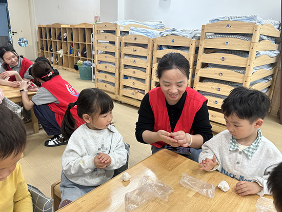 志愿者們充分發(fā)揮專(zhuān)業(yè)所長(zhǎng),貼合幼兒認(rèn)知特點(diǎn),以生動(dòng)有趣、淺顯易懂的語(yǔ)言,向小朋友們講解自然物壓印泥塑的制作方法。她們俯下身來(lái),與孩子們目光平視,耐心示范:如何將一片樹(shù)葉輕輕按在泥面上,如何用花瓣勾勒出春天的輪廓,如何讓自然印記化作風(fēng)鈴上獨(dú)特的紋理。她們的每一次微笑,每一次蹲下,都是專(zhuān)業(yè)課堂向生動(dòng)實(shí)踐的無(wú)聲延伸。