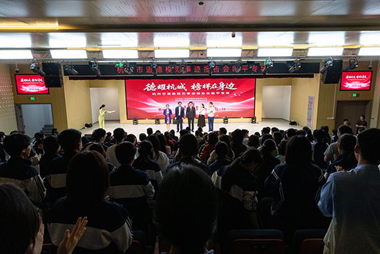 4月20日,恰逢谷雨節(jié)氣,正是作物生長的極好時節(jié),這一天,一場由杭州市文明辦主辦、臨平區(qū)文明辦承辦的“德耀杭城 榜樣在身邊”杭州市道德模范事跡報告會(臨平專場)在杭州市喬司職業(yè)高級中學舉行。全國時代楷模、浙江省道德模范陳立群和杭州市道德模范羅紅英、高玲英、陳有錢、隋永楓走上喬司職高報告廳舞臺,用真摯樸實的講述分享,以崇高的道德品行,把向善向美的種子在每一位學子心頭播種萌芽,讓現(xiàn)場聆聽者經(jīng)受了靈魂的淬煉、思想的洗禮。活動現(xiàn)場,還展出了到場5位講述人以及孔勝東、彭清林等其他共11位道德模范的宣傳展板,吸引師生們紛紛駐足凝神觀看。