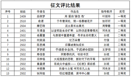 在“我的書適感”讀書征文活動中,同學(xué)們積極品讀經(jīng)典著作,靜心思考、提筆創(chuàng)作,圍繞閱讀感悟?qū)懴乱黄瓌?chuàng)文章。大家緊扣書籍內(nèi)涵,結(jié)合自身經(jīng)歷與思考,作品主題鮮明、內(nèi)容充實、思想深刻。學(xué)校嚴格遵循原創(chuàng)原則,語文組專業(yè)教師對所有征文進行認真指導(dǎo)與評審,評選出校內(nèi)一、二、三等獎,并擇優(yōu)推薦優(yōu)秀作品參與區(qū)級比賽,充分展現(xiàn)了學(xué)院青年學(xué)子扎實的文學(xué)素養(yǎng)與積極向上的精神風貌。