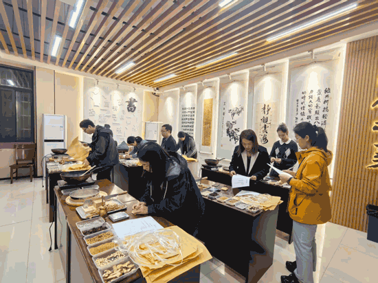 桌面上整齊擺放著三十種常見中草藥標本,學員們需在規定時間內寫出每味藥材的名稱及主要功效。從狗脊、赤小豆到冬瓜皮、玉米須,大家提筆疾書,自信從容。“這個考的是真功夫,光靠死記硬背不行,必須平時多看、多聞、多摸。”學員小李坦言,培訓期間他每天對著藥材標本反復辨認,還拍了照片回家復習,“今天全部認出來了,很有成就感。”考評員們認真核對著每一份答卷,頻頻點頭。