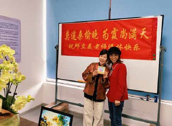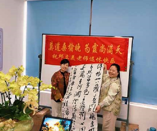 三尺講臺存歲月,同事相伴暖人心。教師代表紛紛獻上心意禮物:童師香老師贈送由非遺剪紙傳承人蔣娟老師創作的剪紙作品,匠心滿滿;宿歷老師贈予雅致蝴蝶蘭盆栽,寓意美好;陳麗春老師送上由王敦宏老師書寫的作品,筆墨寄情。同時,陳麗春老師精心制作退休紀念視頻,里面有全體教師的祝福,營造溫馨濃厚的氛圍。